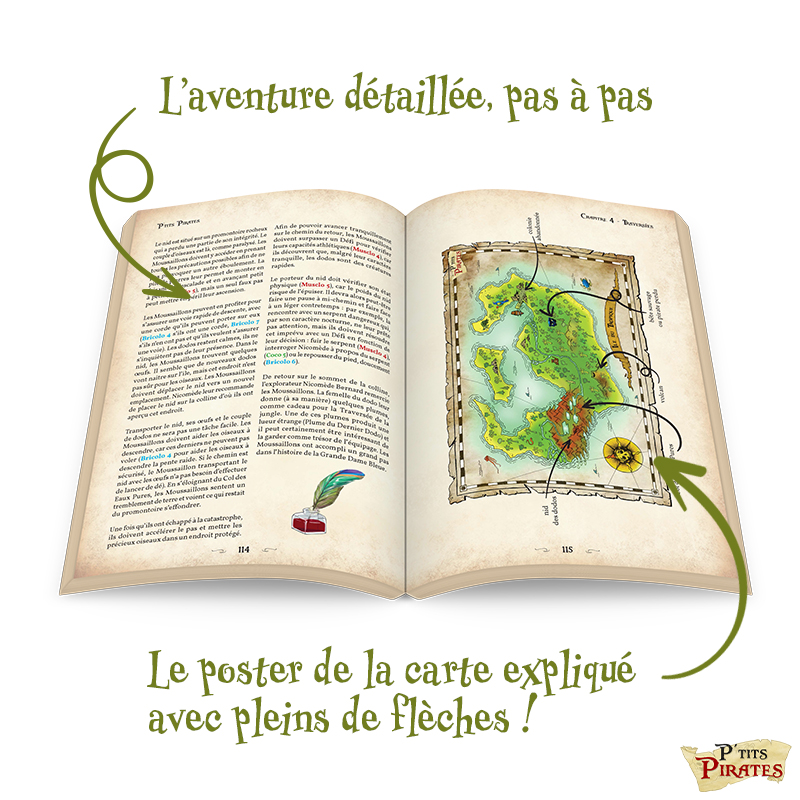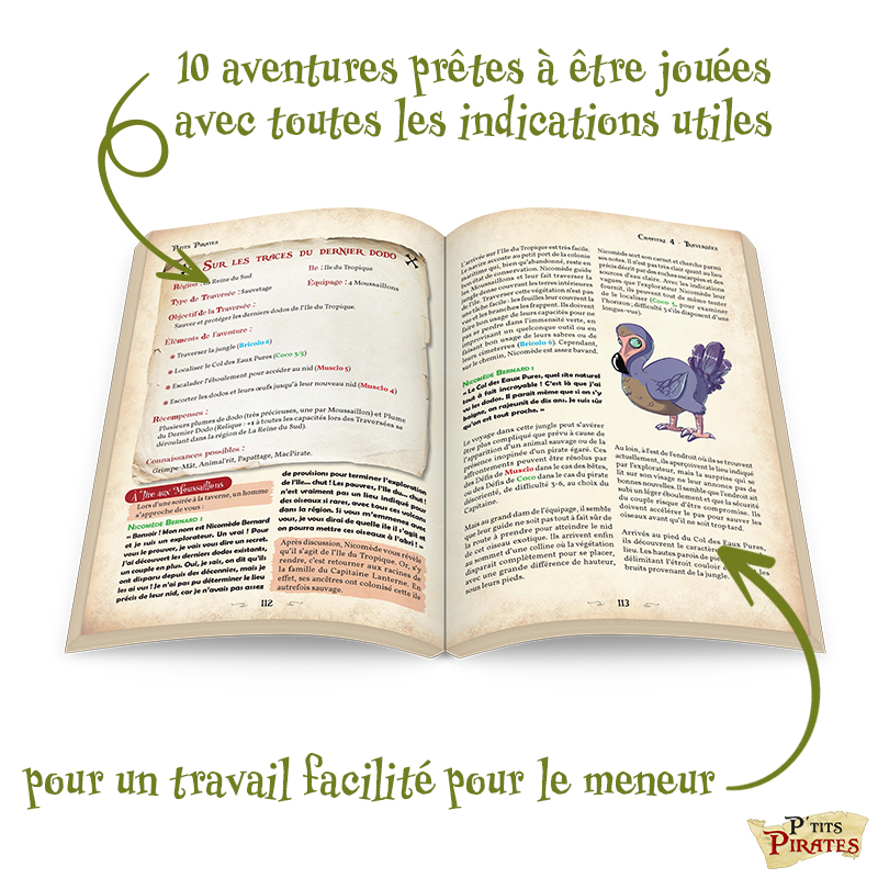 Trouver une fleur particulière qui ne pousse que sur une ile bien précise, empêcher un abordage, trouver le trésor d’une pirate renommée ou sauver les derniers Dodos existants sont quelques exemples de ce qui attend les P’TITS PIRATES au cours de ces dix Traversées.