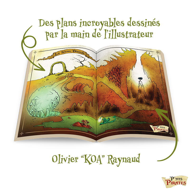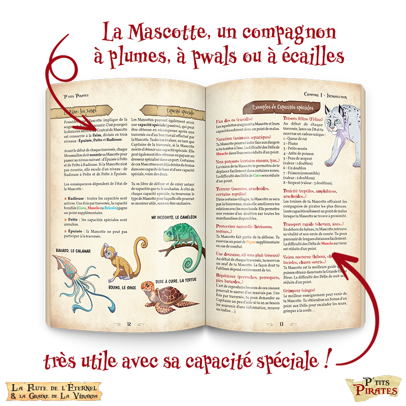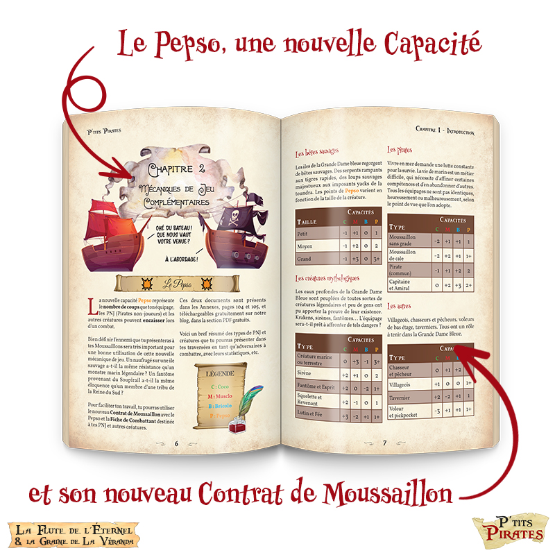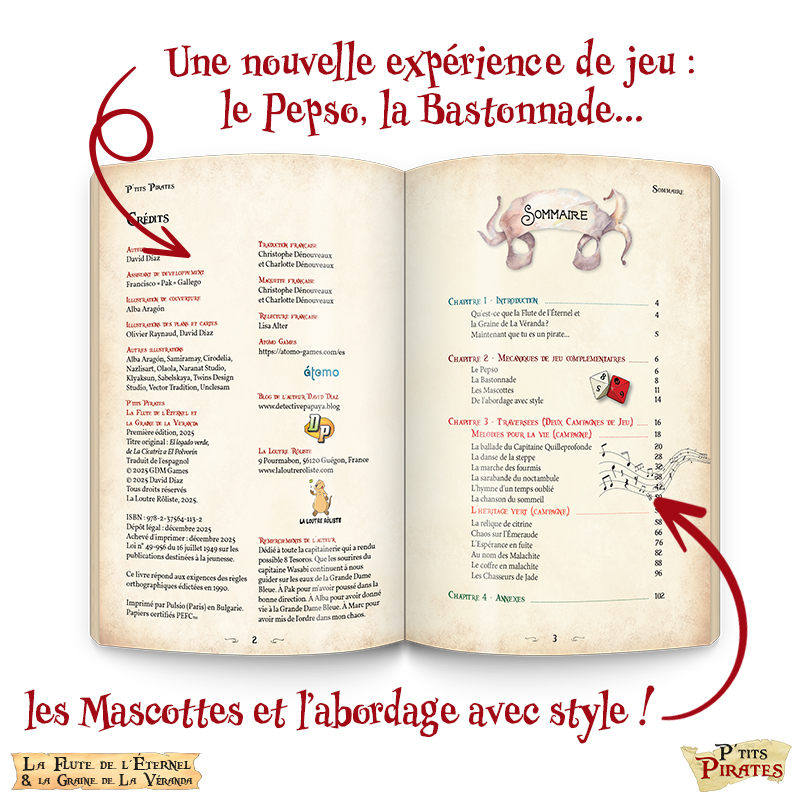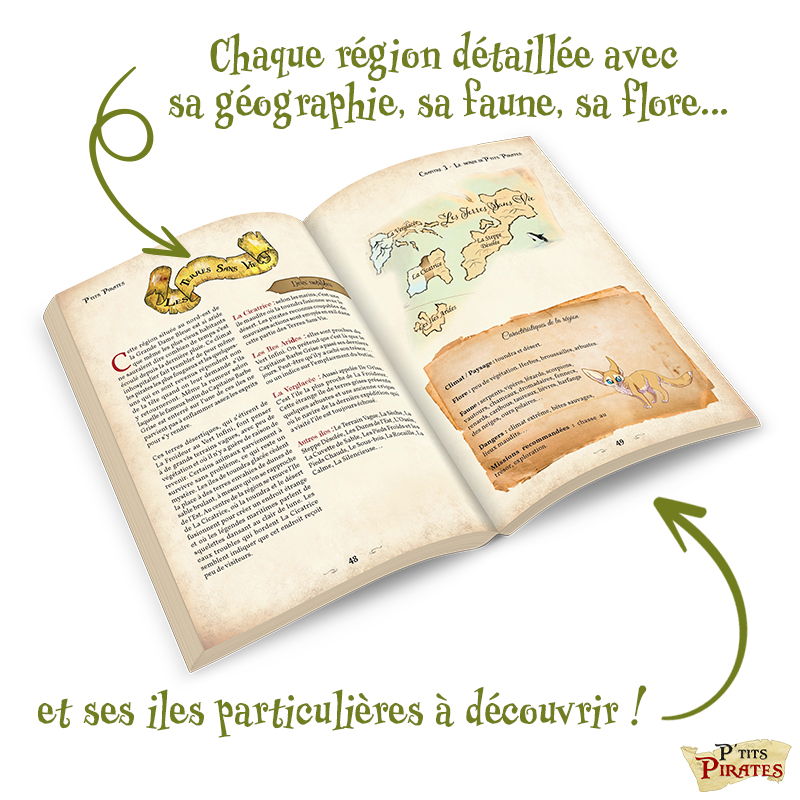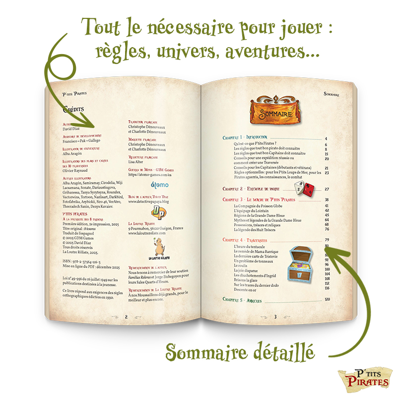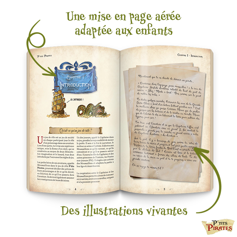 Le livre de base, à l’origine en noir et blanc et de 96 pages dans sa version espagnole, est tout couleurs et la maquette est retravaillée pour une plus grande lisibilité pour les enfants. Ainsi, le livre est augmenté, passant à 152 pages et au même format (17x 24 cm) que Petits Détectives de Monstres (déjà paru). P’TITS PIRATES est un vrai livre de jeu de rôle jeunesse, à destination des lecteurs enfants et adultes !