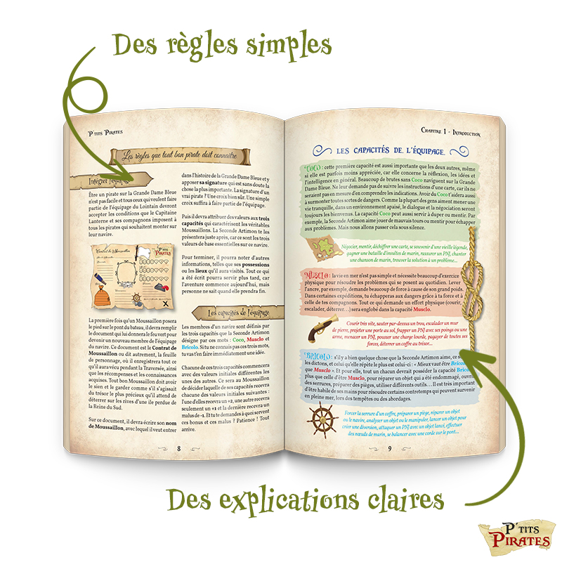 P’TITS PIRATES, jeu de rôle destiné aux rôlistes en herbe à partir de 6 ans, propose un système de jeu très simple et porte un intérêt tout particulier aux connaissances et compétences que les P’tits Pirates acquerront au cours de leurs péripéties. Crayon, gomme, feuille de pirate, un dé à 8 faces et leur imagination, voilà ce qu’il faut pour y jouer !
