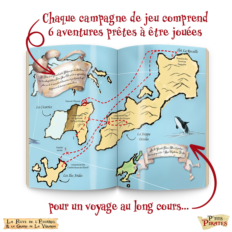 Les Moussaillons vont parcourir, sur terre et sur mer, les huit régions qui composent la Grande Dame Bleue. 10 Traversées sont proposées dans le livre de base, afin que vous puissiez jouer rapidement. P’TITS PIRATES permet de proposer des parties “one-shot” ou en campagne plus ou moins longue.